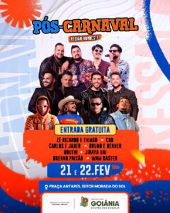 A Prefeitura de Goiânia, por meio da Secretaria Municipal de Cultura (Secult), realiza neste sábado (21/2) e domingo (22/2), a partir das 18h, uma programação especial de pós-Carnaval, na Região Noroeste. O evento será realizado na Praça da Feira, no Setor Morada do Sol, com entrada gratuita.