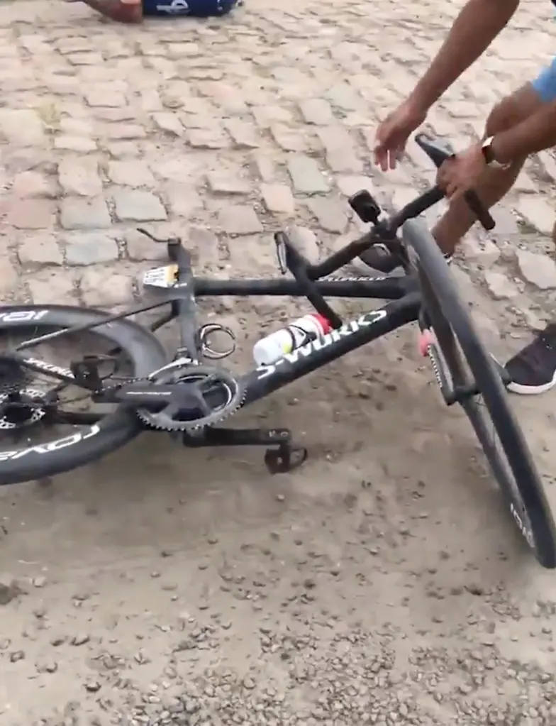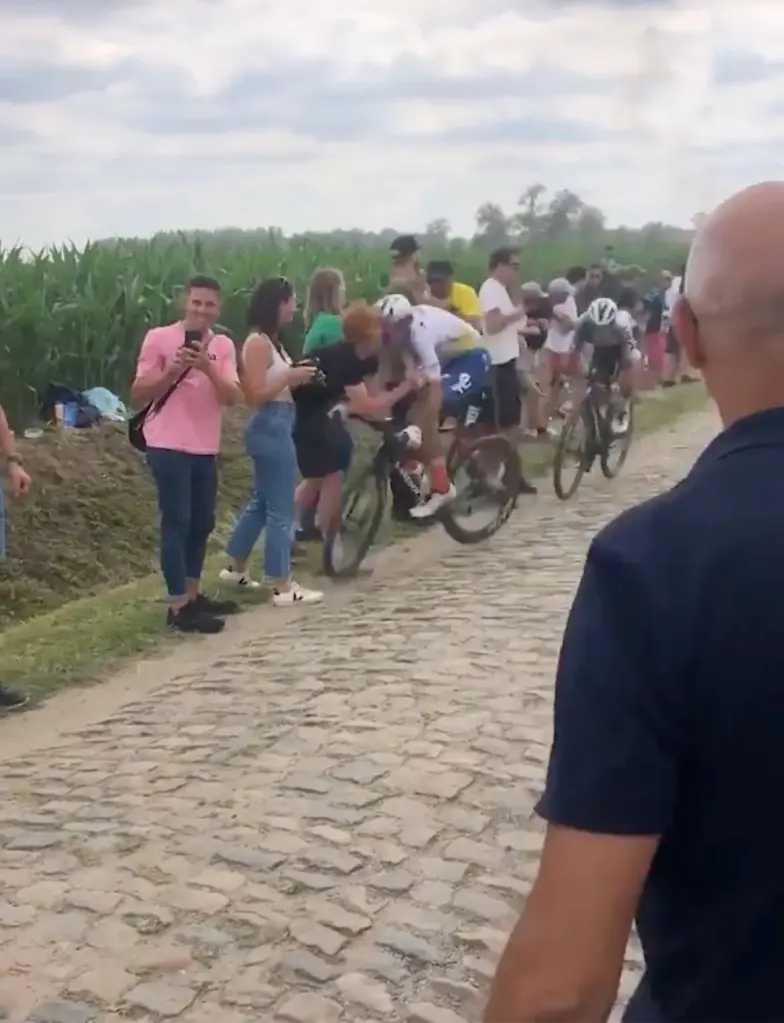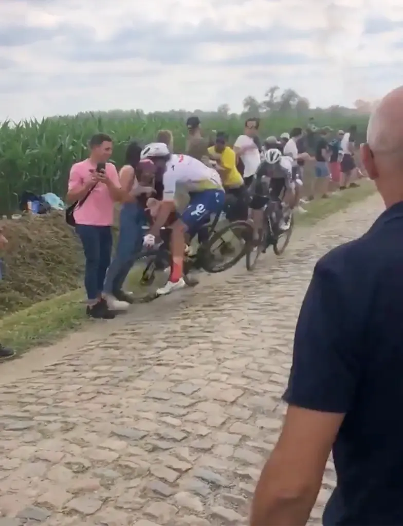 Imagens do acidente no Twitter mostram Oss colidindo com a fila do espectador ao lado da pista de corrida e voando para fora de sua bicicleta. Vários torcedores pareciam voar para o chão no terceiro dos 11 trechos de paralelepípedos na rota de Lille a Arenberg.