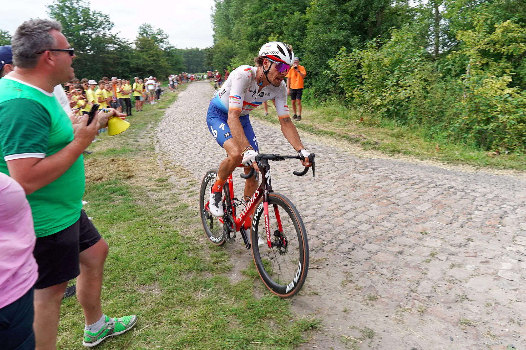 Oss, 35, colidiu com um fã no estágio 5 da corrida, que parecia se inclinar para o caminho de paralelepípedos enquanto filmava os ciclistas em seu telefone.