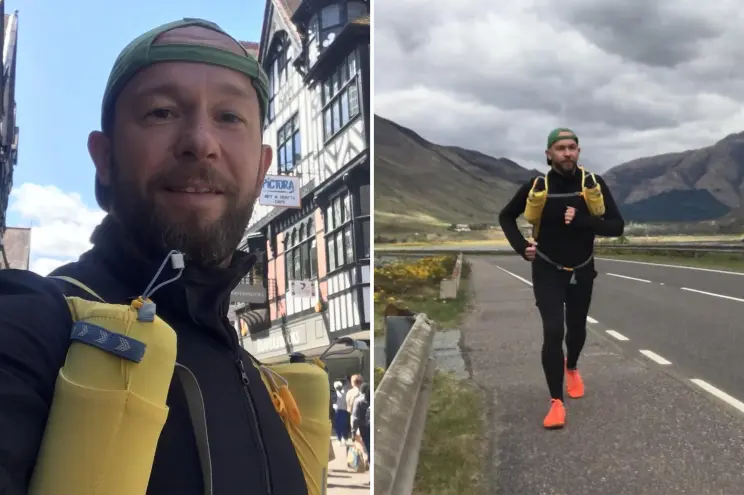 Ele vem treinando para sua corrida, completando cerca de 40 quilômetros por dia em todo o Reino Unido.