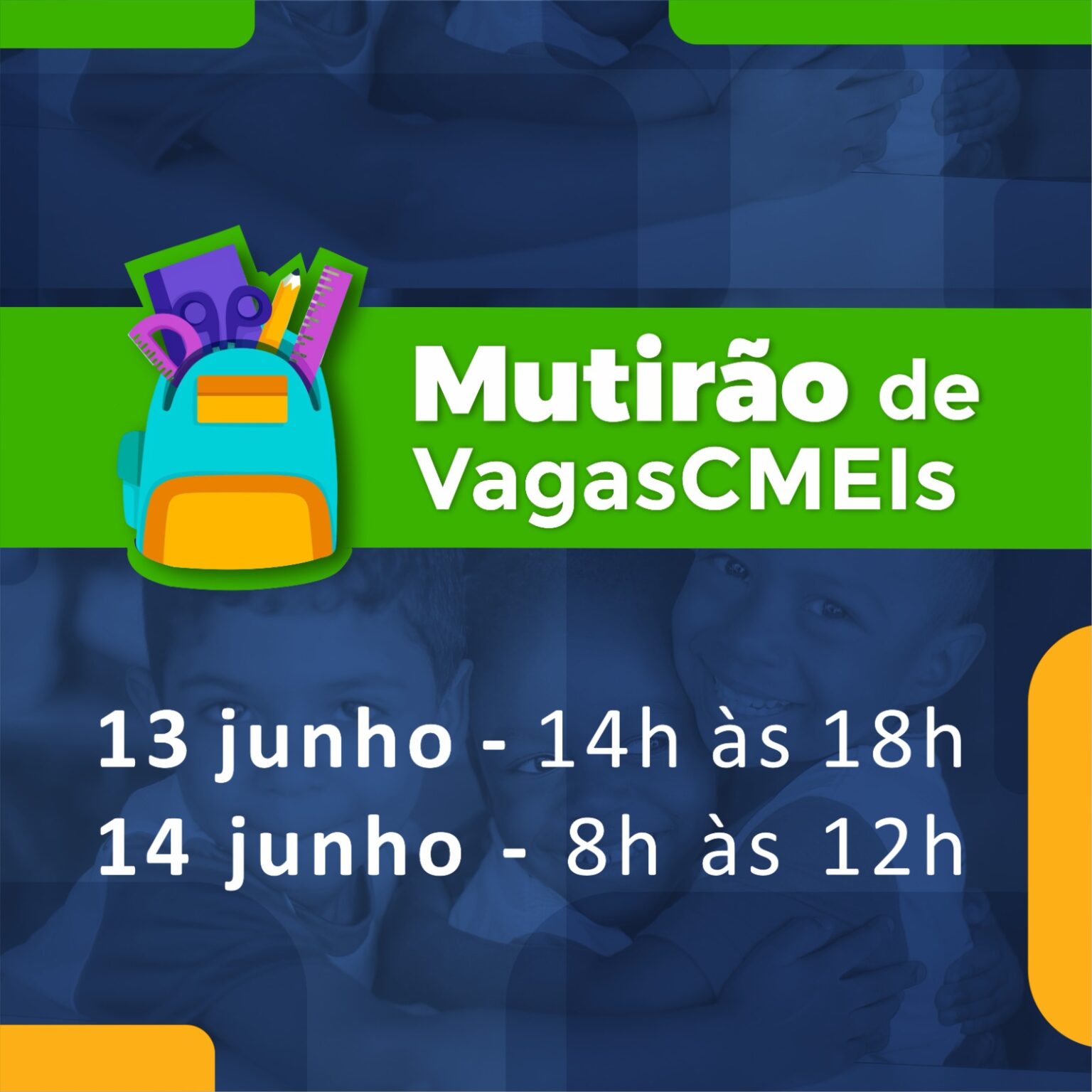 • Durante o Mutirão de vagas, será oferecido espaço kids com brincadeiras, contação de história e cantinho da leitura, para que os pais sejam atendidos com tranquilidade.