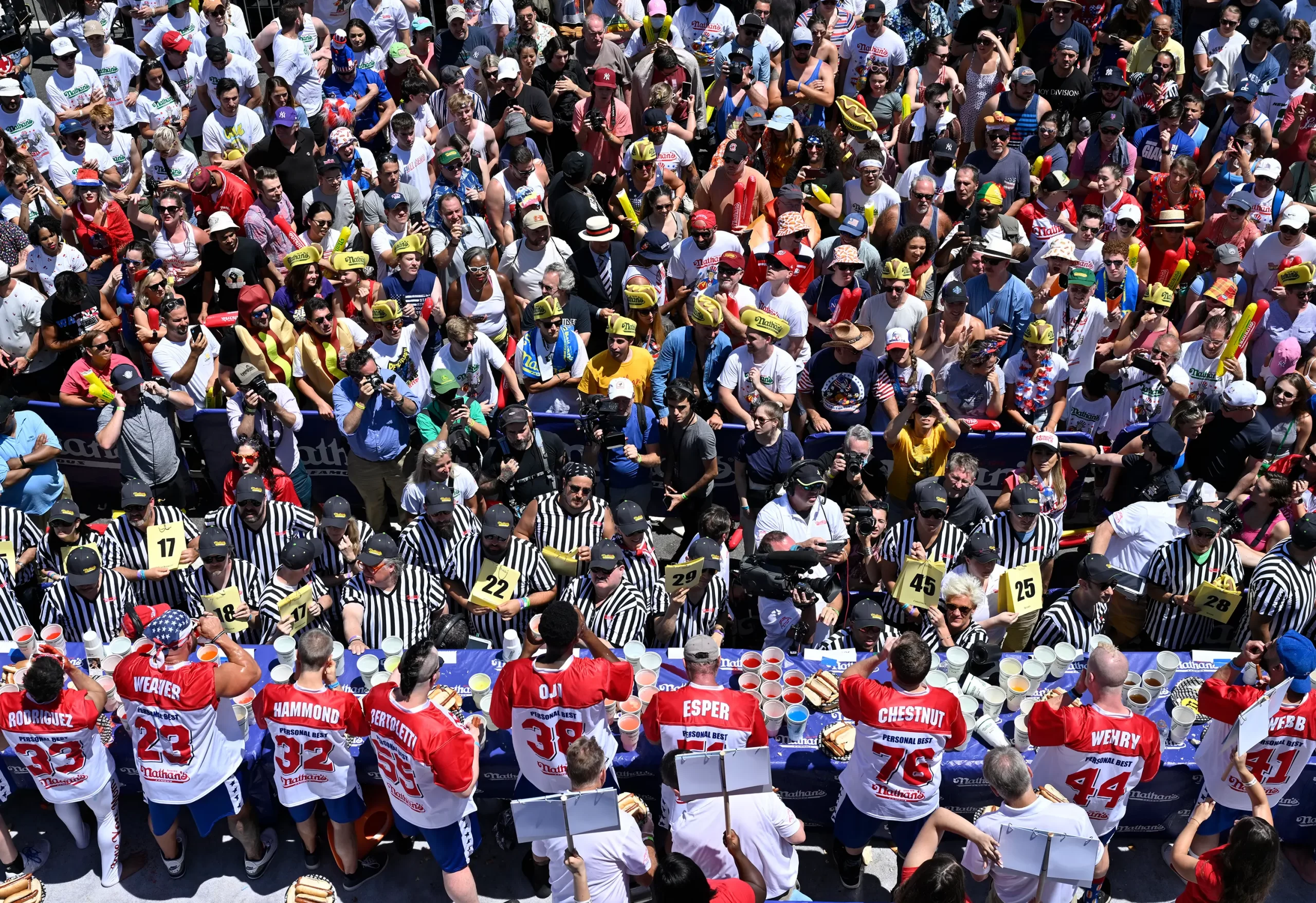 - A multidão aplaude os competidores do Nathan’s Hot Dog Eating Contest na segunda-feira. Paul Martinka