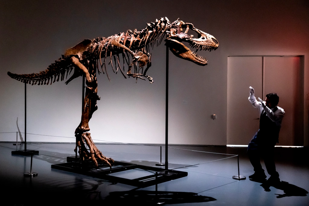 O esqueleto fossilizado de um parente do T. rex que vagou pela Terra há cerca de 76 milhões de anos será leiloado em Nova York este mês, anunciou a Sotheby’s na terça-feira.