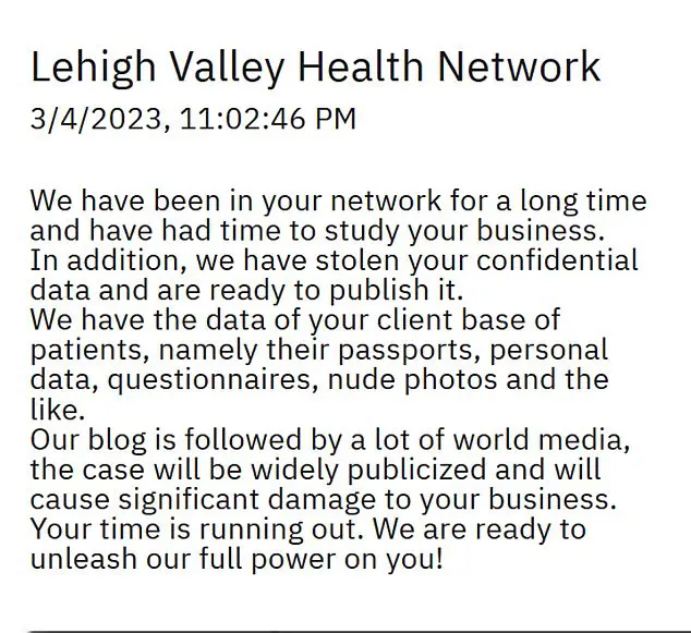 A Lehigh Valley Health Network (LVHN) disse que três fotos íntimas de pacientes recebendo tratamento oncológico com radiação estavam entre os itens postados online pelo BlackCat – “uma gangue de ransomware associada à Rússia”.