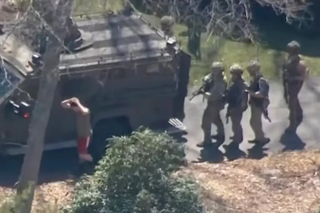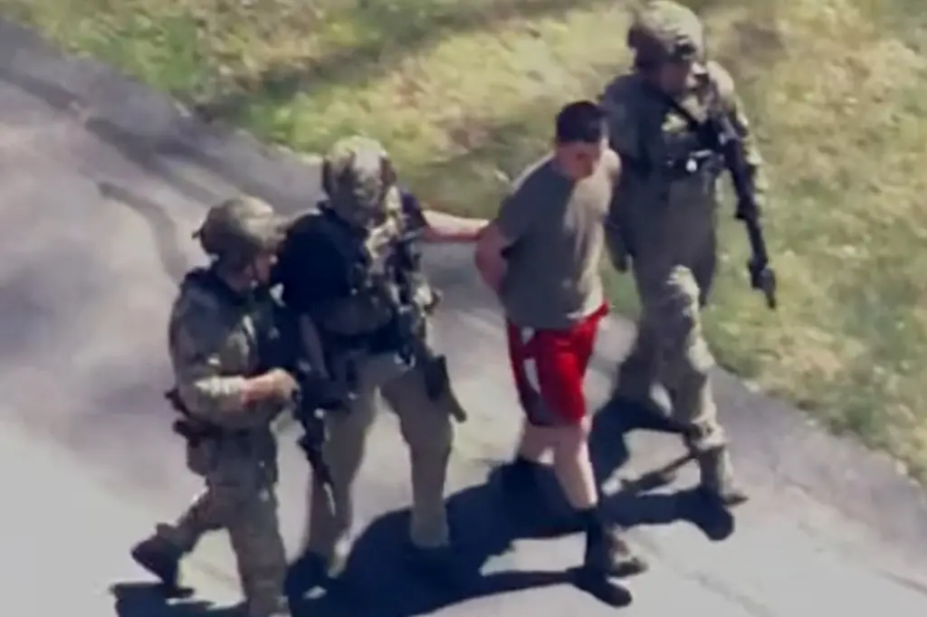 Imagens de helicóptero mostraram Teixeira, vestido com shorts de basquete vermelho e uma camiseta cinza, rendendo-se ao que pareciam ser agentes do FBI camuflados.